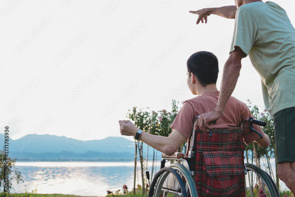 A young man with disability in wheelchair and his parent on the lake at sunset with background of the hill, Health care for the sick or person with disabilities, rehabilitation with natural therapy.