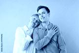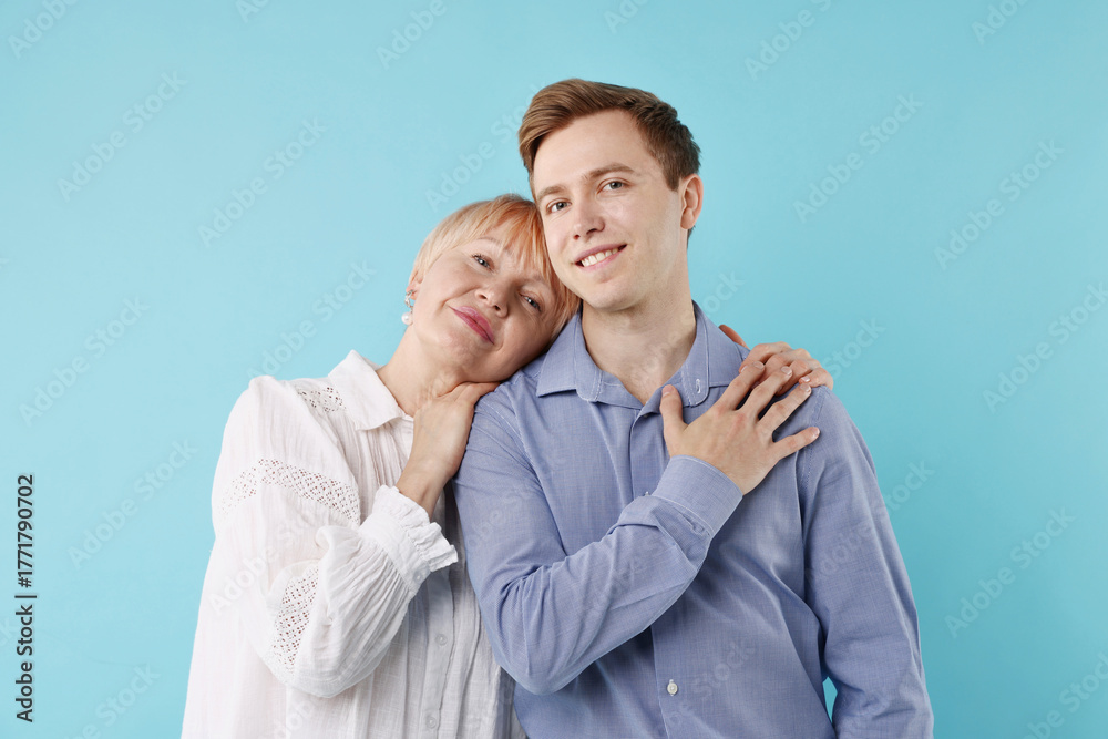 Mother hugging her son on light blue background