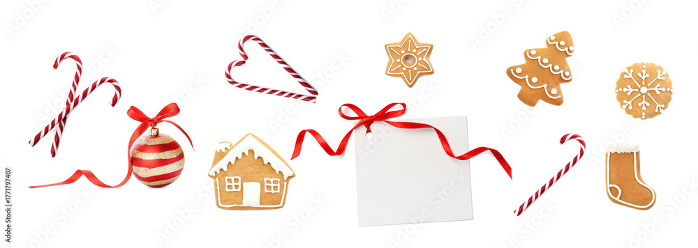 Christmas candy canes, cookies, blank greeting card and festive ball isolated on white, set