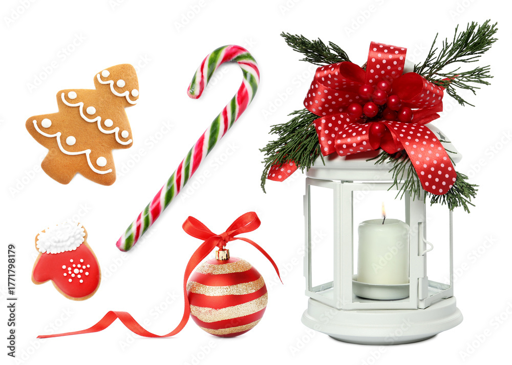 Christmas candy cane, gingerbread cookies and festive decor isolated on white, set