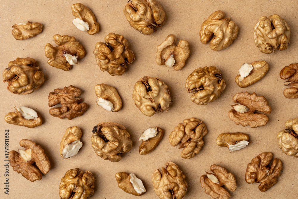 Raw Walnut Kernels on Brown Background for Natural Organic Snack Concept
