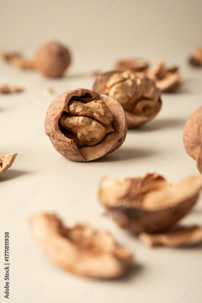 Walnuts and Shells Close-Up for Natural Organic Food and Rustic Simplicity Concept