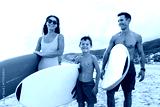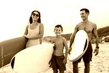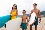 Happy multiracial family having surfing lesson at the beach during summer vacation