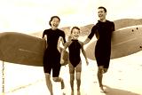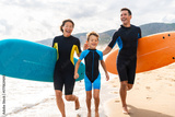 Happy multiracial family having surfing lesson at the beach during summer vacation