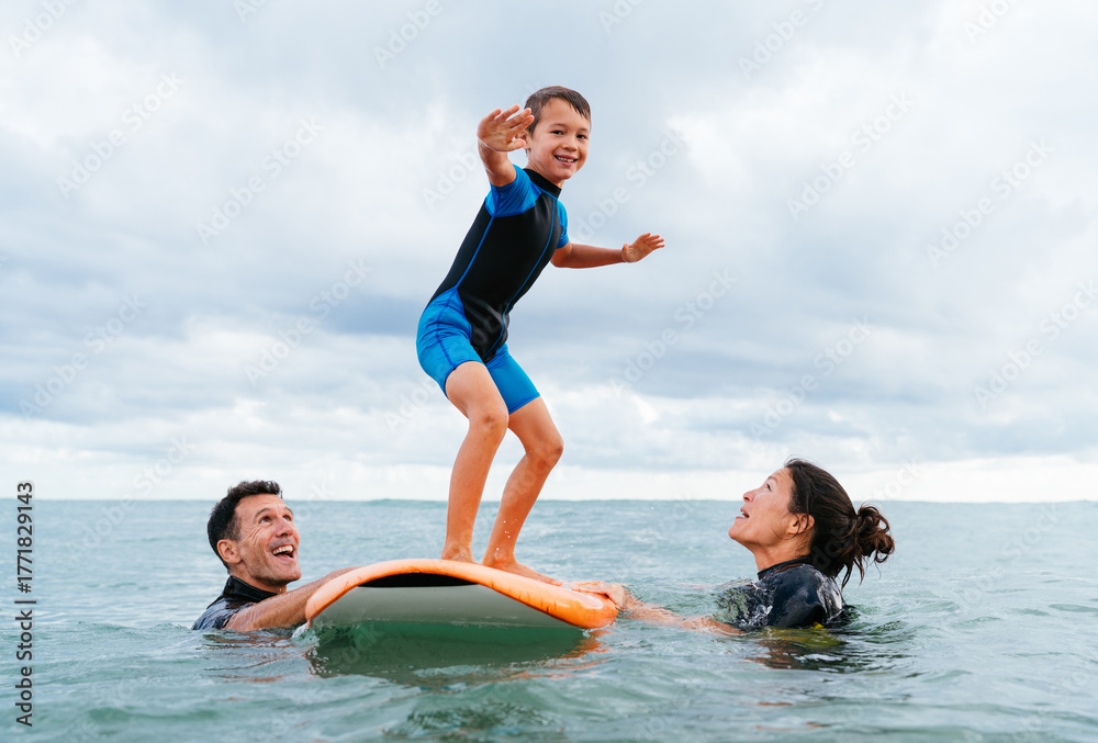 Happy multiracial family having surfing lesson at the beach during summer vacation