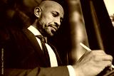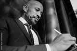 Side profile of business professional concentrating on digital tablet with stylus, captured in urban daylight, highlighting individual focus, mobile efficiency, and digital freedom in work.