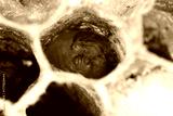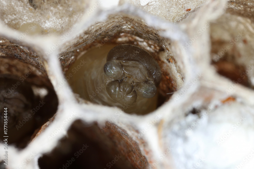 Larva of the common paper wasp (Polistes) in a cell of the nest made from a kind of paper produced by wasps chewing wood.