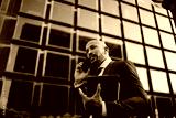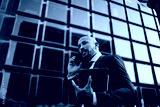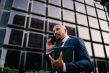 Businessman joyfully smiling while looking into distance, holding smartphone, communicating energy, positivity and confident digital focus in business-oriented mindset.
