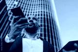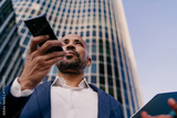 Focused businessman activating smartphone voice assistant, showing precision, mobile efficiency and fluent tech use in high-rise digital workplace.