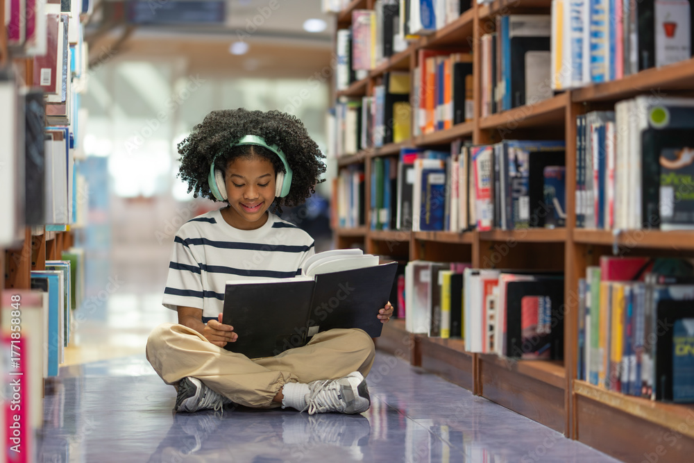 Young girl with headphones sitting on library floor, enjoying book between bookshelves in educational school.