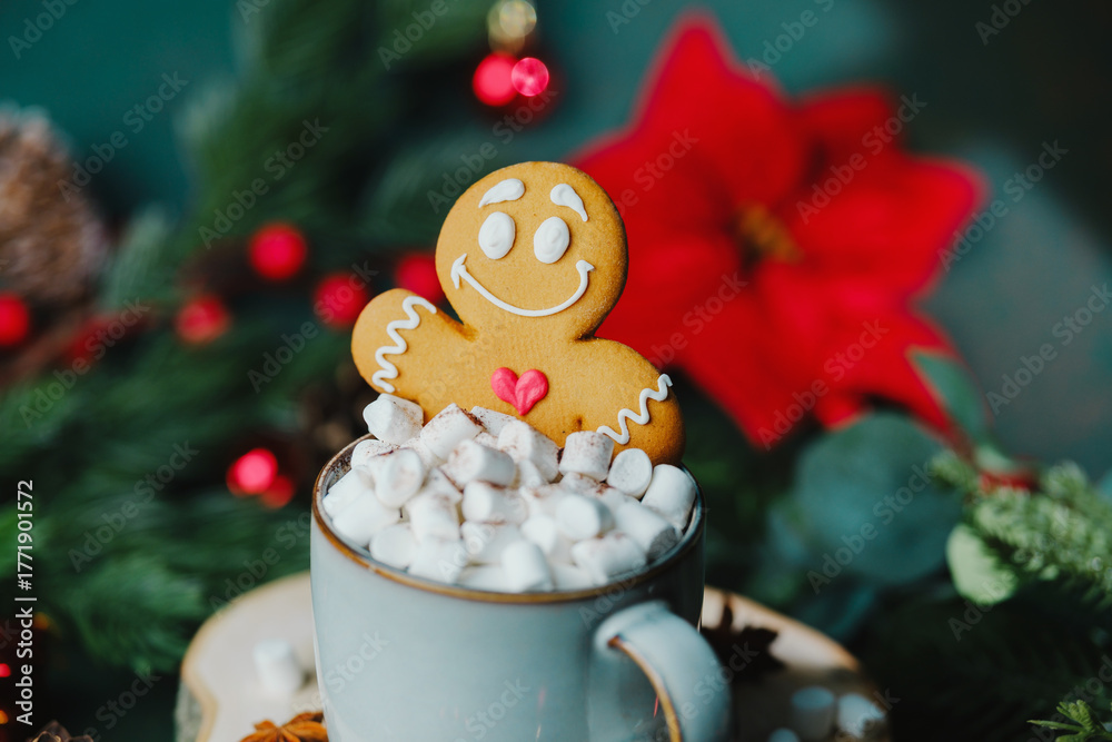 Christmas gingerbread man cookie sits on marshmallow hot chocolate drink near festive evergreen branches