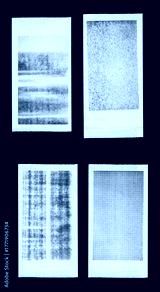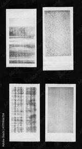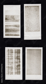 Four separate thermal paper receipts featuring abstract monochrome patterns and textures, arranged on a black background.