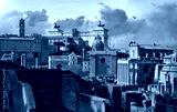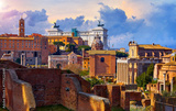 Roman Forum in Rome, Italy. Antique structures with columns. Wrecks of ancient italian roman town. Sunrise above famous architectural landmark by the Capitoline Hill. Dramatic sky.