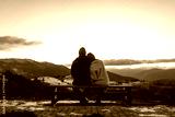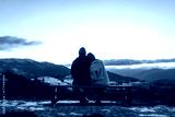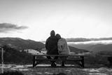 Couple in love enjoying landscape of winter Carpathian mountains sitting on bench at sunset. Back view. Space