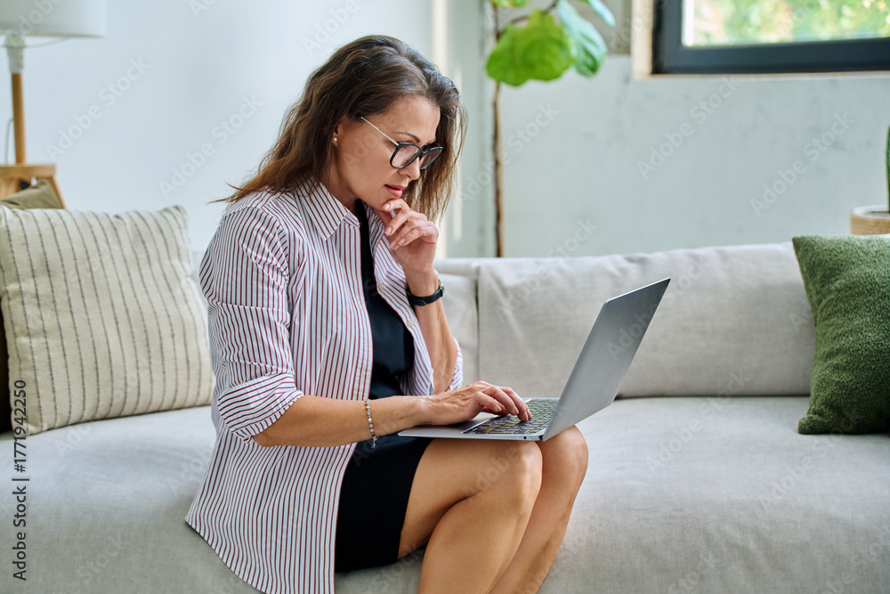 Portrait of serious middle aged woman using laptop sitting on sofa