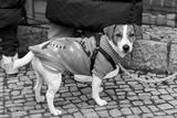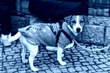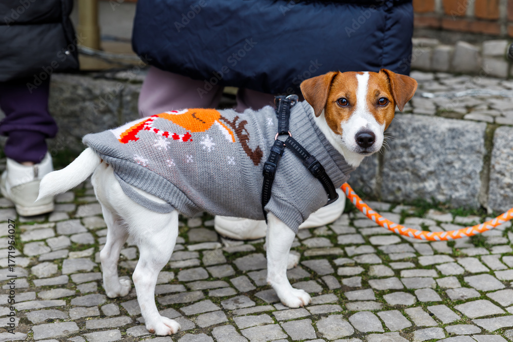 Small Jack Russell dog in festive grey sweater stands on cobblestone street with curious gaze. Orange leash and knitted outfit create warm, cheerful winter street moment