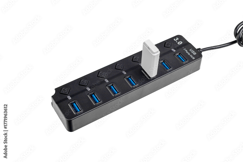 A USB 3.0 hub with 7 ports and power buttons on a white background offers versatile connectivity. Its compact design suits various tech needs.