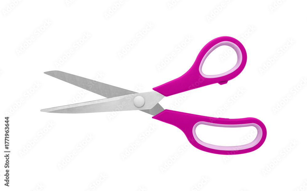 A pair of Pink handled scissors in half-open position on a white background, displaying stainless steel blades and ergonomic handles. Suitable for precision cutting in office or craft, isolated image.