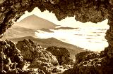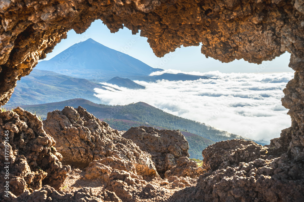 Mount Teide framed by volcanic rocks above the clouds, Tenerife, Canary Islands, Spain