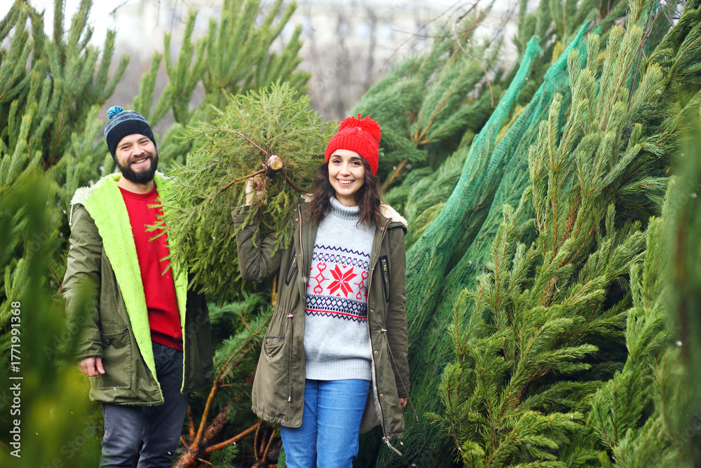 young man and woman choose a Christmas tree in a Christmas tree shop.
