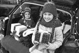 little girls are smiling while sitting in the trunk of a car and holding Christmas gifts in their hands against the background of Christmas tree branches, a red plaid and Christmas lights.