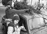 little girl with pigtails holds a branch of a Christmas tree in her hands against the background of parents who tie a Christmas tree to the roof of a red retro car.