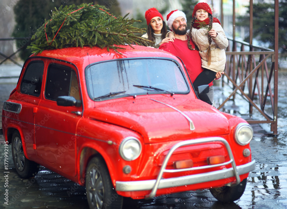 mother, daughter and father in Santa's hat are hugging and smiling on the background of a red retro car with a Christmas tree on the roof.