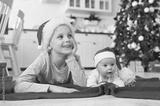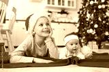 brother with little sister baby in santa hats lie and smile on the background of the christmas tree.