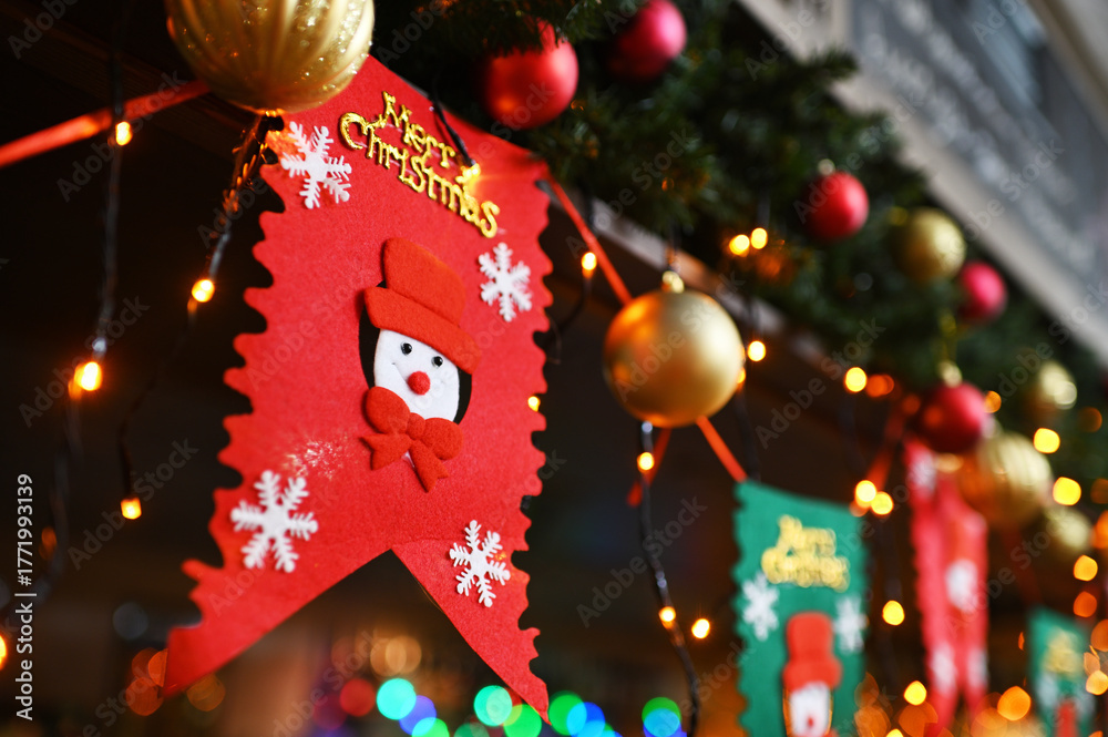 Christmas decor with a picture of a snowman and an inscription Merry Christmas on the background of Christmas lights