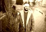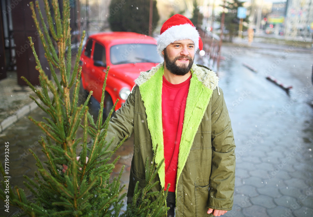 bearded man in santa hat holding a christmas tree in his hands and smiling on the background of a red retro