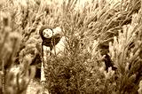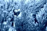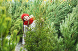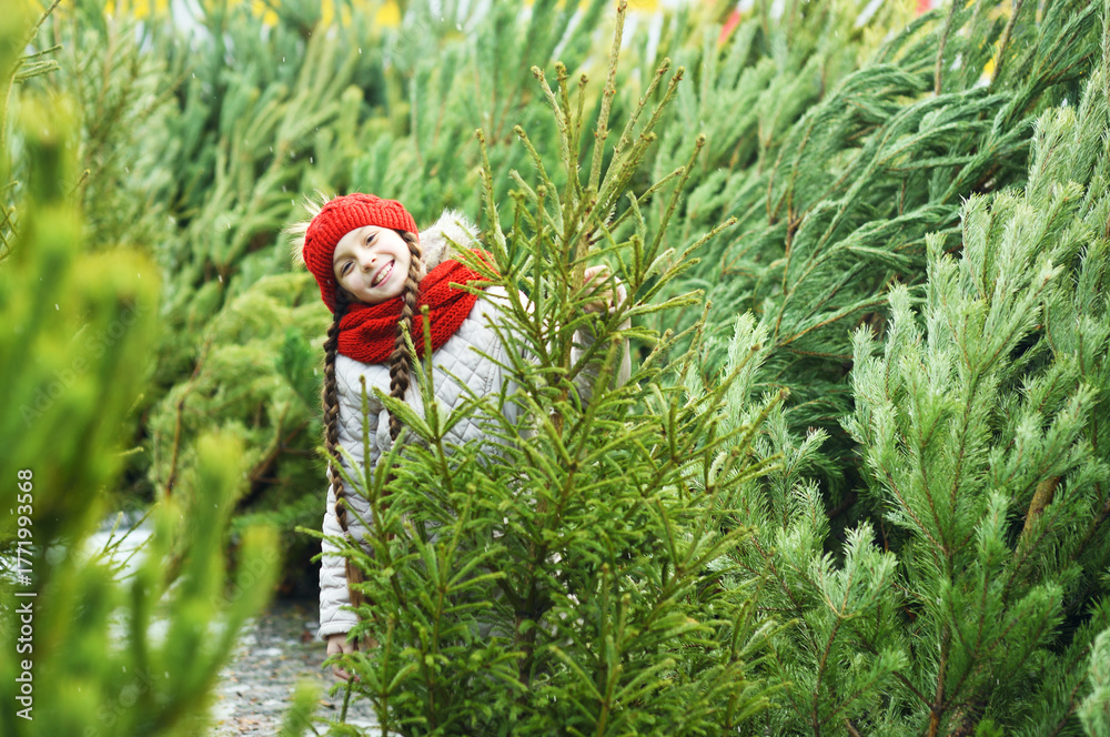 little girl with pigtails in a red knitted hat and scarf smiles on the background of the Christmas tree market and chooses a Christmas tree