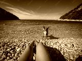 PORTRAIT, POV: Female owner looks at her brown Scottish shepherd mix standing alert on pebble beach by turquoise water. Playful canine expression and Adriatic backdrop radiate warmth and coastal charm