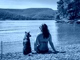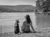 Woman in a bikini sits beside her dog on a peaceful Adriatic beach, looking out over calm water and green coastline overgrown with lush pine trees. Summer relaxation in the embrace of pristine nature.
