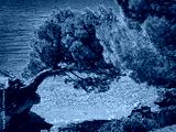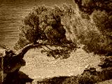 Windswept pine tree leans over crystal clear Adriatic water. Vivid green foliage contrasts beautifully with the turquoise sea, reflecting the serene and timeless character of the Mediterranean coast.