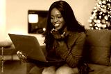 A cheerful African American young lady is video calling on her laptop at home. She blows a kiss to the screen, enjoying the moment and feeling festive during the holiday season.