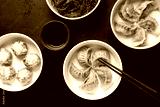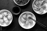 Top view of Chinese dinner with different dumplings. Ravioli, Shao mai, Goma wakame or seaweed salad.