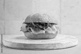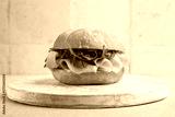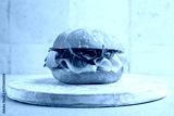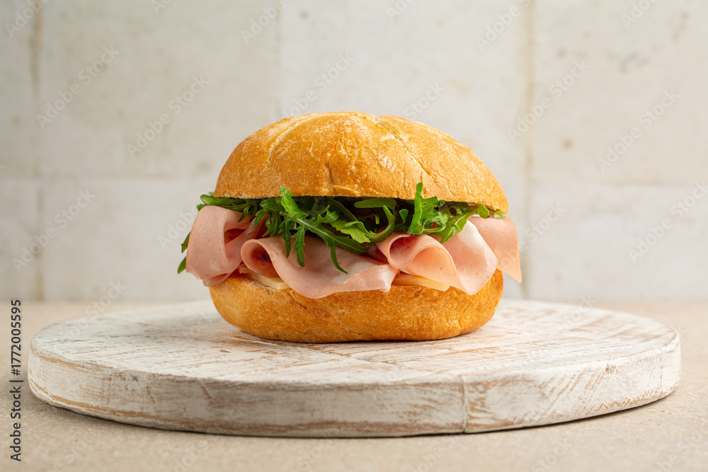 Mortadella sandwich with cheese and arugula on a white wooden board.
