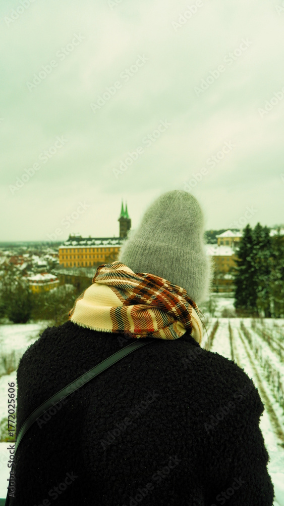 A young woman walks through a quiet winter city, wrapped in a warm coat and scarf