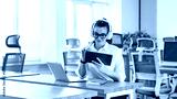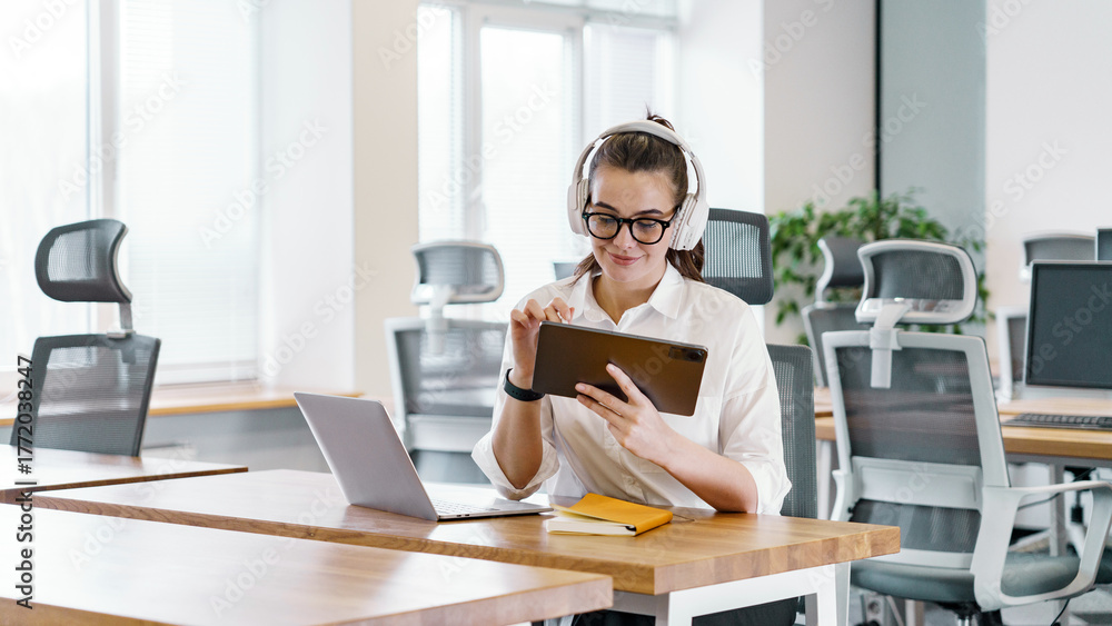 Young woman using tablet in modern office space while seated at table