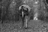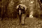 Happy couple walking under yellow umbrella in autumn park, dressed in matching brown coats and red accents, smiling and enjoying romantic walk surrounded by colorful fall foliage.