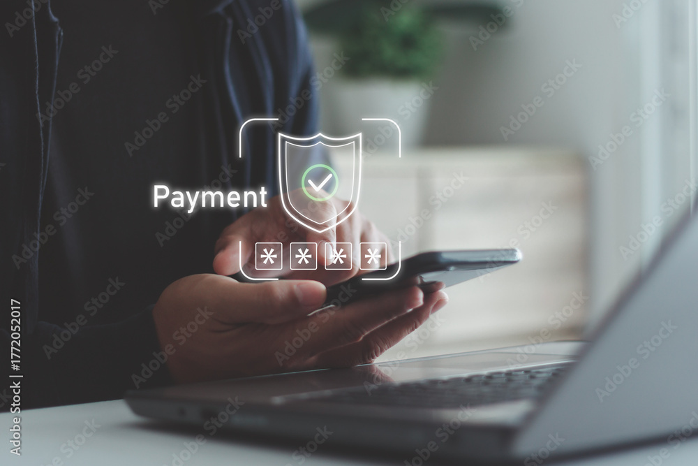 Secure online payment concept. Person using mobile phone and laptop, showing data protection, digital transaction and financial technology for safe money transfer and authentication.