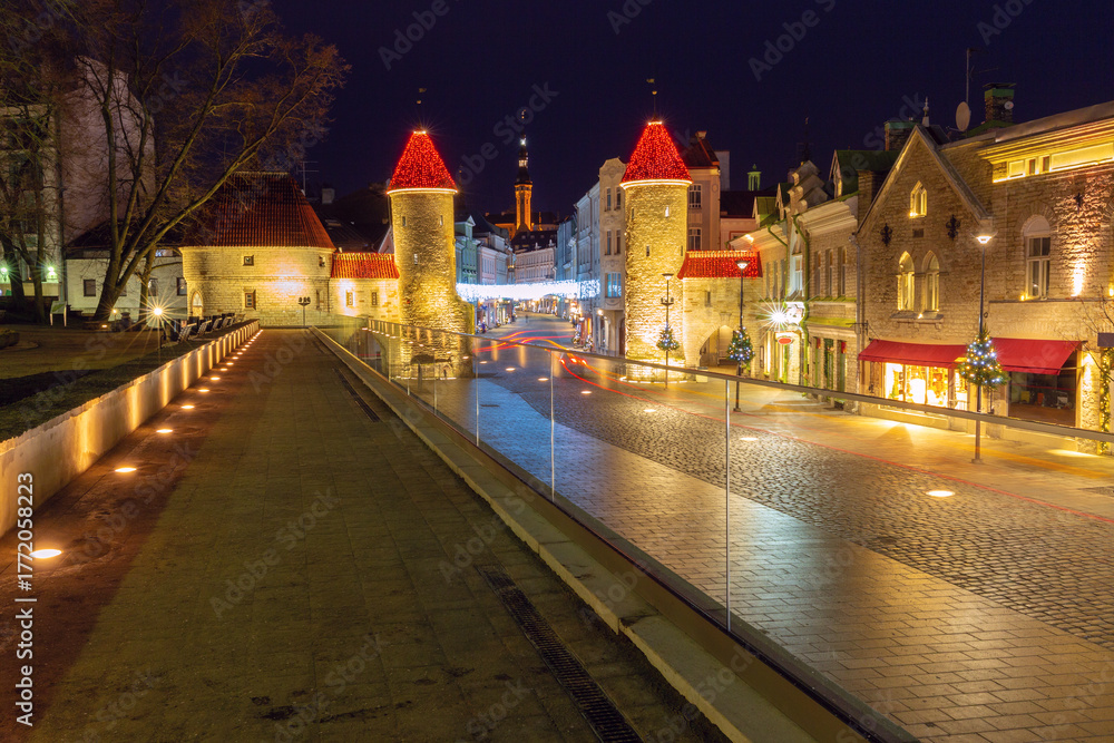 Historic Viru Gate decorated with lights at night in Tallinn, Estonia