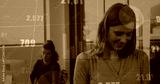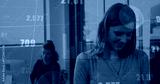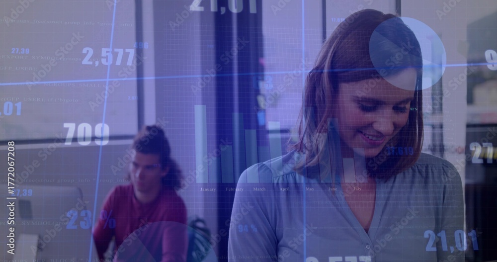 Smiling female worker standing at desk in open-plan office, with laptop, floating financial charts