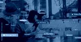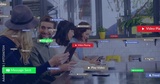 Sitting friends using mobile devices at cafe counter with coffee cups, showing floating UI graphics