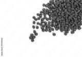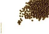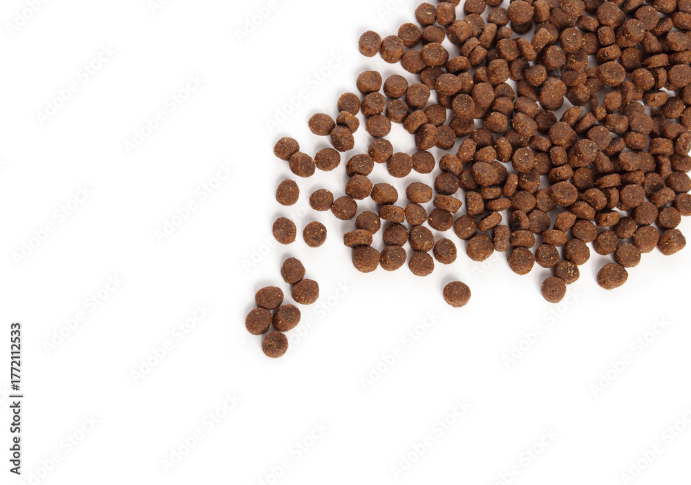 Scattered kibbles on white. Top view of dry insect protein kibble made from black soldier fly larvae. Hypoallergenic pet food for dogs and cats with food allergies or sensitivities. Selective focus.