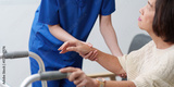 Healthcare Support. Nurse assisting elderly patient with mobility aid.