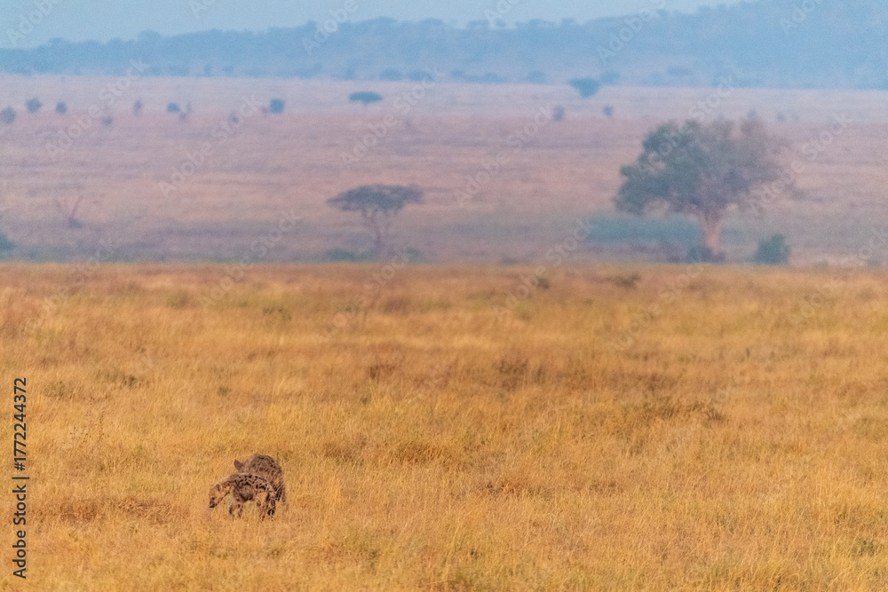 Telephoto of a Spotted Hyena - Crocuta crocuta- scavenging in the bushes of the Serengeti, Tanzania