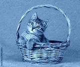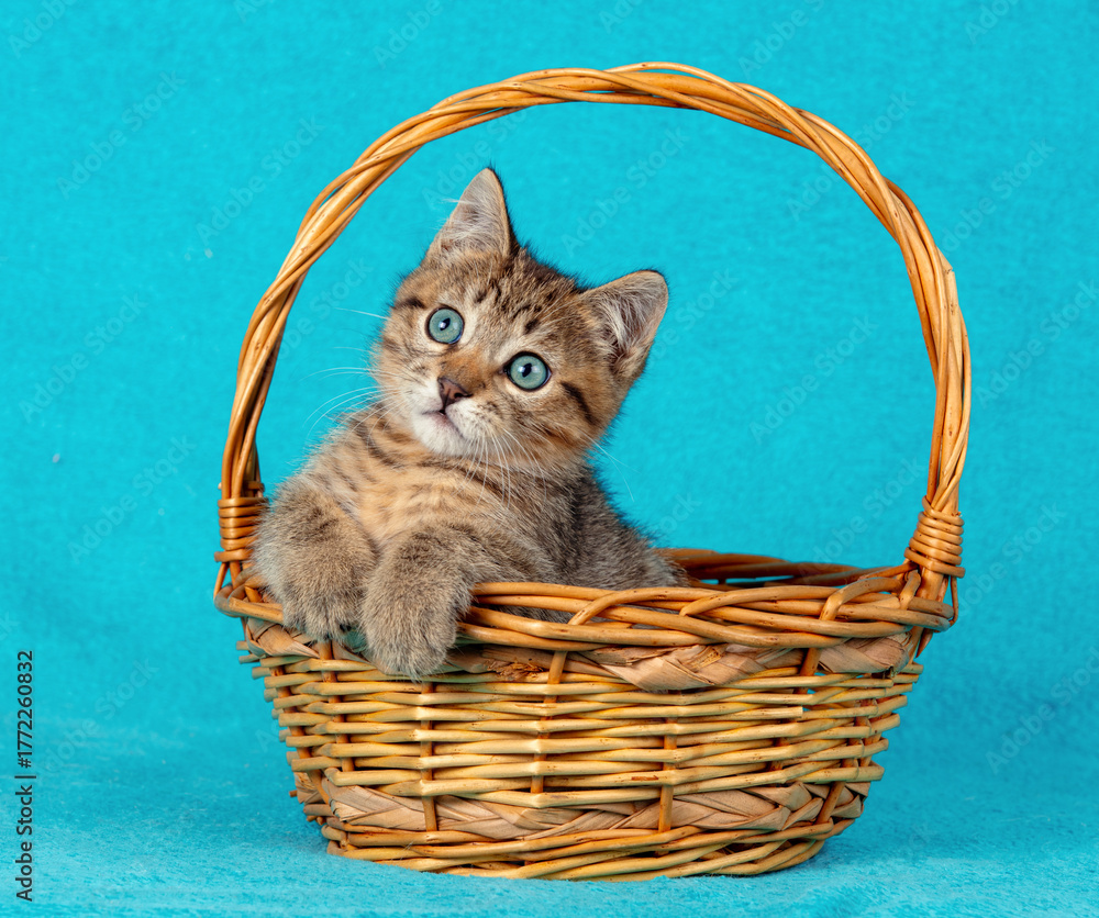 A cute kitten sits in a basket on a blue background