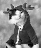 Cute cat in a Christmas costume on a blue background. Portrait of a funny black and white longhair cat dressed in a red pullover with deer antlers