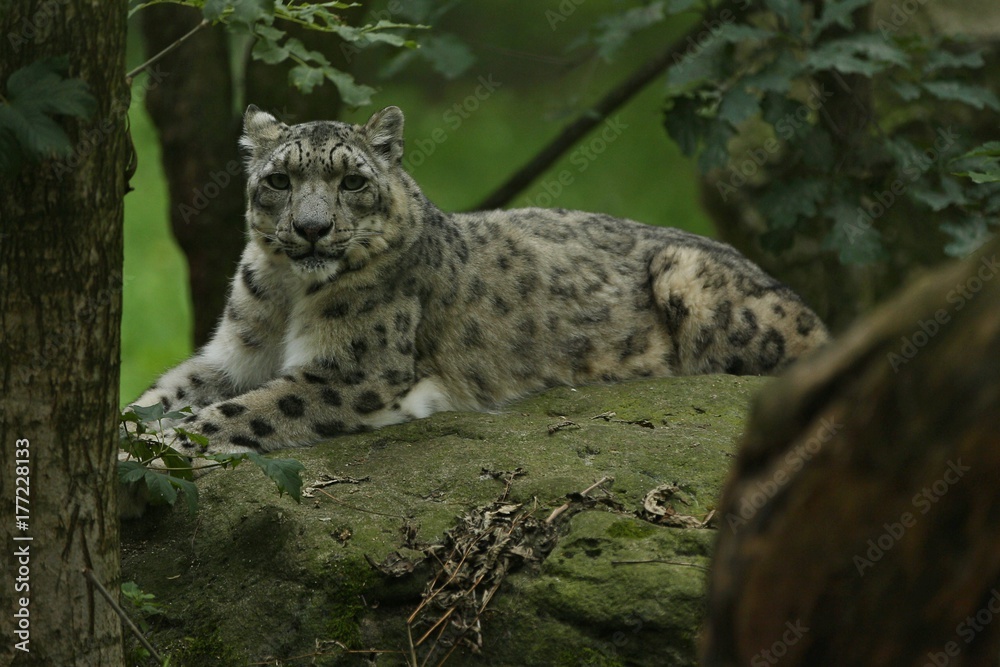 Endangered snow leopard resting in the nature habitat. Wild animals in captivity. Beautiful asian feline and carnivore. Uncia uncia.